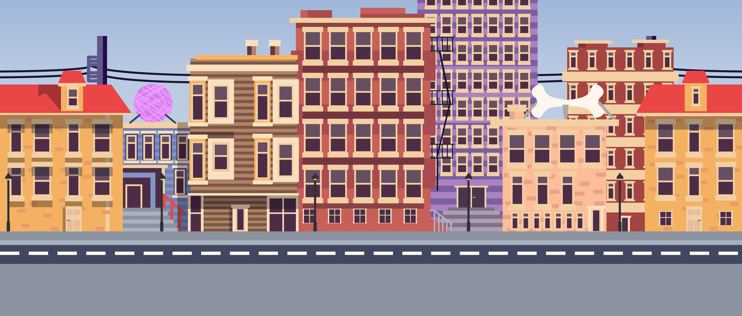 The purpose of this assignment was to create a looping animation that exhibits a narrative using techniques of scale, rotation, and positioning. This assignment allowed for pure imagination, which led to excitement and an abundance of ideas for potential products. In the end, a cat who is late for the bus stop was chosen as the narrative subject. The rain effect was added because it highlights the stress and haste of the cat in this situation. Little details like the yarn ball and the bone on some of the houses further imply the narrative being set in a world